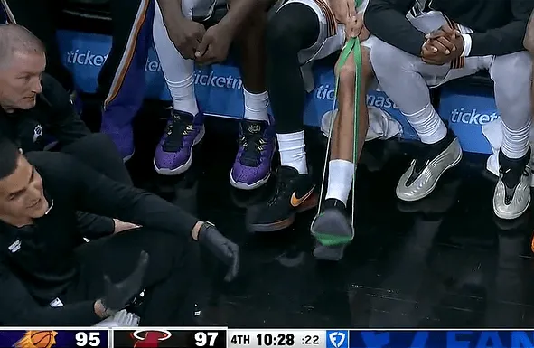 比赛第四节,布克目前已返回场边,用弹力带尝试着左脚脚踝的感觉。
